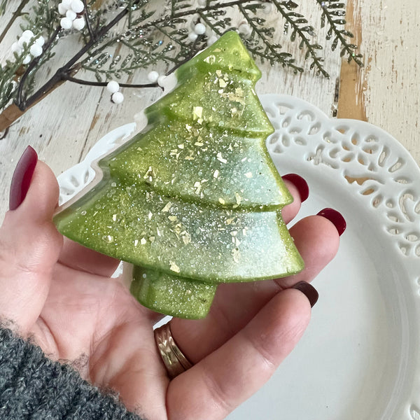 Parker works hard and is excited to make these soaps. He is grateful for all the support given and loves having his own little business. Each bar is about 3 oz. This artisan soap is a green tree with a white back embellished with gold glitter. Think of a holiday Spruce with vanilla creamer in it. That is what this delicious soap smells like! Pure heaven.
