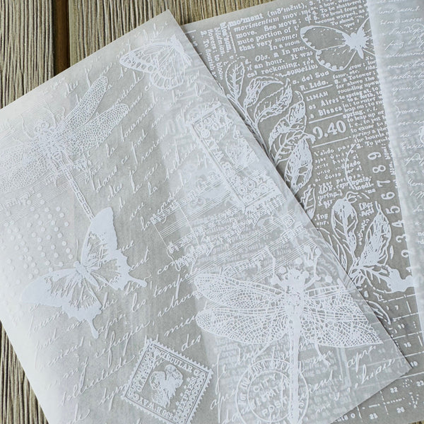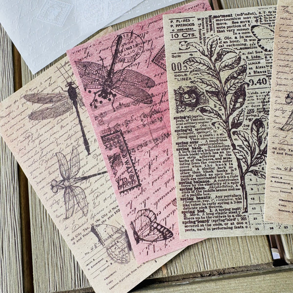 4"x5.5" collage paper sheets. 30 pieces total. Mix of printed Vellum & printed paper